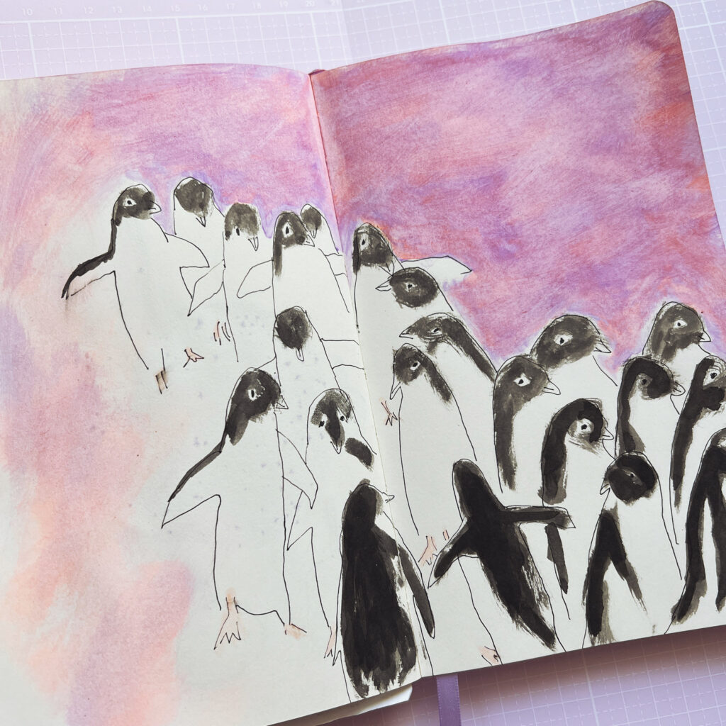 我其實不常畫背景,但是當我畫好企鵝們時,我想是要讓它留白還是畫上背景呢?老實說我没有可以填背景的工具,我的刷子都很小,唯一較大的刷子是給壓克力顏料用的,而我不愛用壓克力顏料,我也不愛用蠟筆,所以我總是跳過背景。