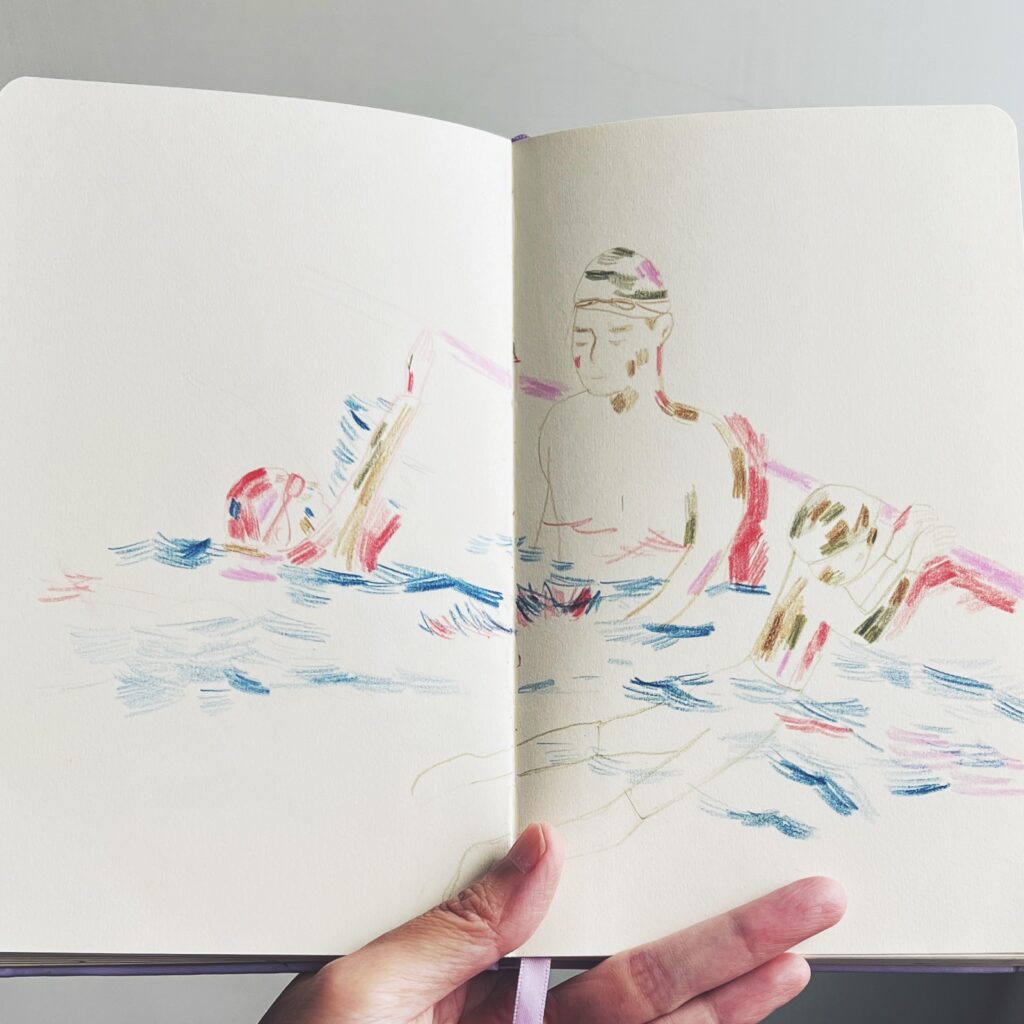 我愛上了在泳池寫生,泳池的人幾乎不會停止,幾秒就會移動,寫生變得很有趣,我在泳池畫著一顆接著一顆的頭,連著好幾天,因為我的眼睛還無法捕捉一直在移動的人。